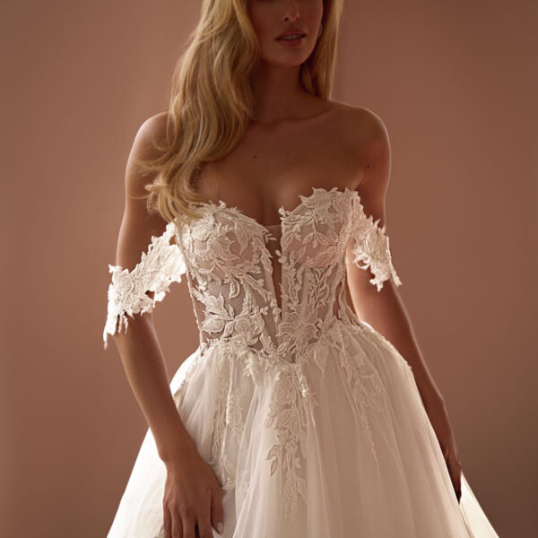 Captivating in a deep V neckline wedding dress, featuring a beaded english net bodice adorned with delicate beading with elegant lace, flowing into a full tulle split skirt and a lovely back ,detachable side sleeves.