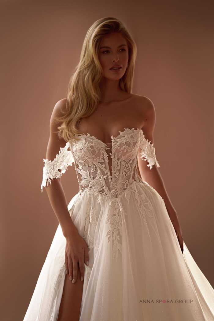Anna sposa aline style gown with hand beaded corset,tulle airy splitskirt ,in ivory nude.