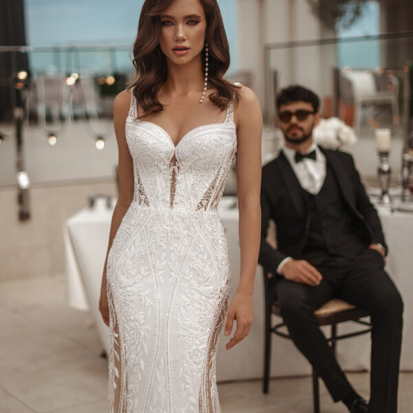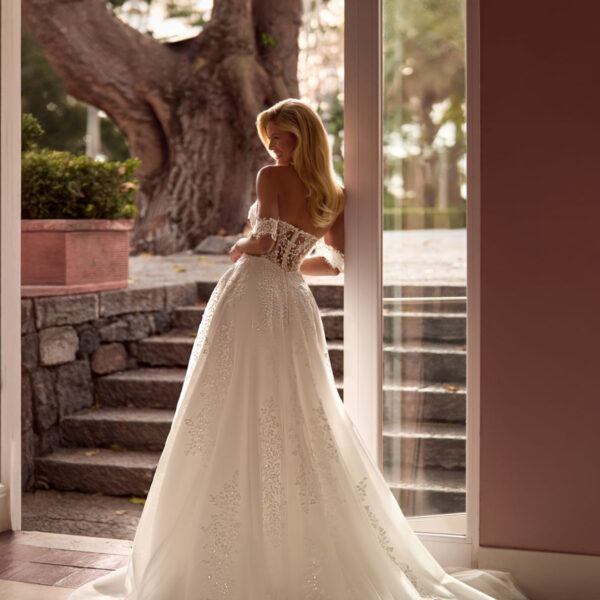 Captivating in a deep V neckline wedding dress, featuring a beaded english net bodice adorned with delicate beading with elegant lace, flowing into a full tulle skirtĀ and a lovely back ,detachable side sleeves.