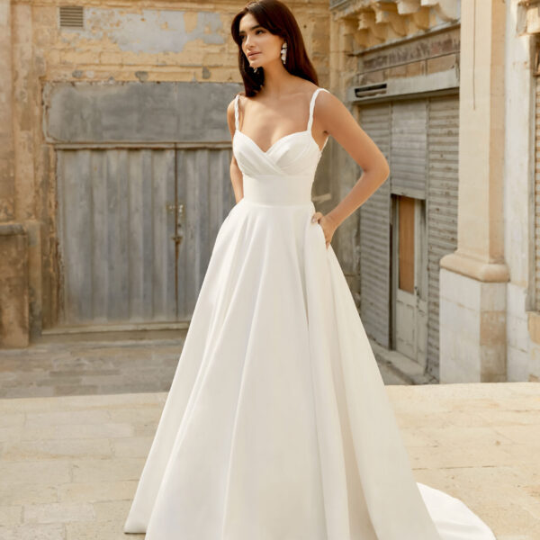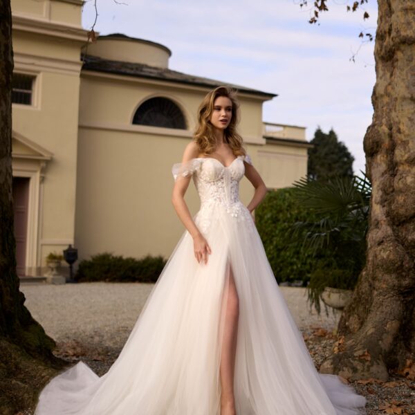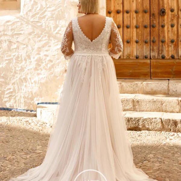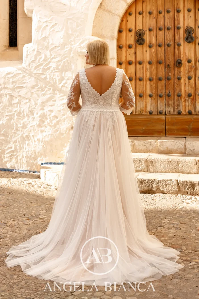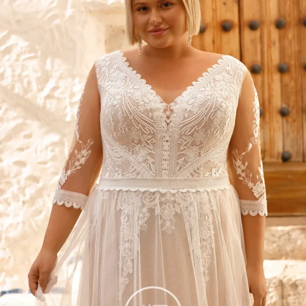 English net 3D lace appliques A-Line Gown with Plunging Sweetheart Neckline with side sleeves .
