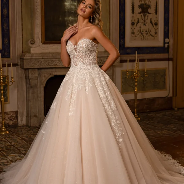 Captivating in a sweetheart neckline wedding dress, featuring a beaded lace bodice adorned with delicate flowers, flowing into a full tulle and glitter skirt with lace canvas.