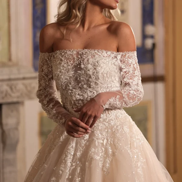 Daniella di Marino a princess gown with lace tulle skirt and glitter,in ivory.