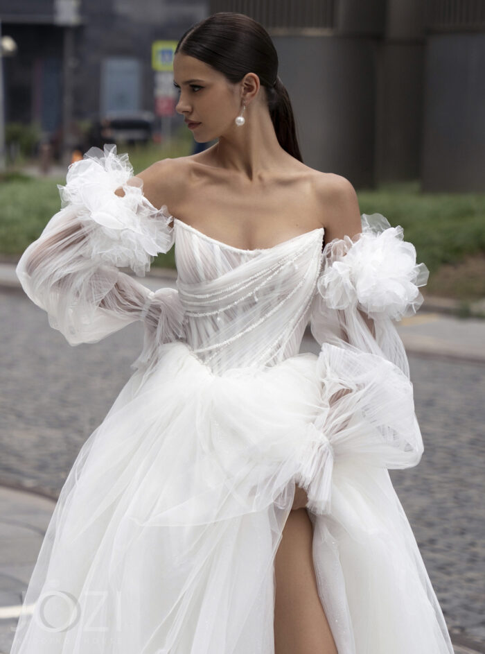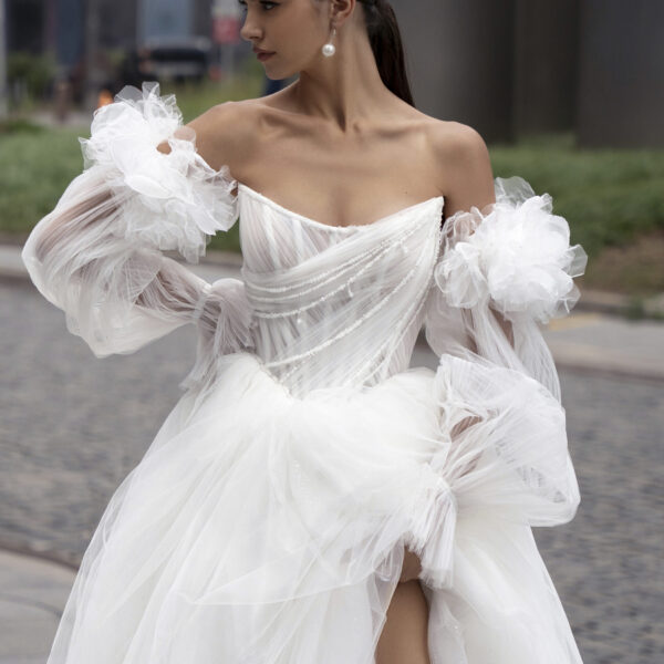A luxurious gabbiano collection tulle A-line dress with a scoop neckline that is accented with beads , crystals and shinning glitter, with detacheble sleeves