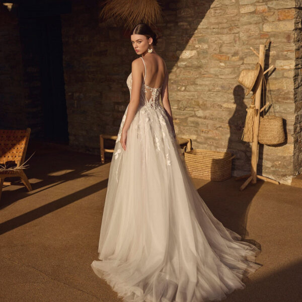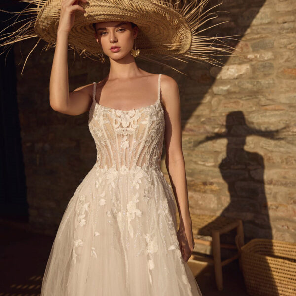 English net,glitter corset lace appliques A-Line Gown with Plunging Scoop Neckline with straps .