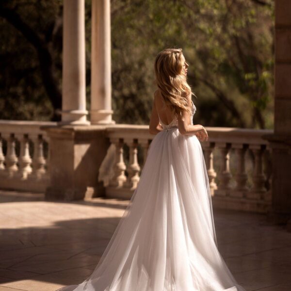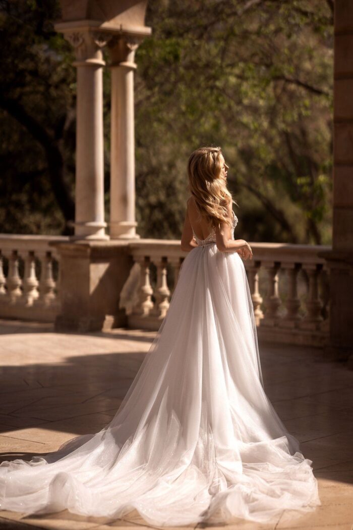 A fishtail wedding dress with thin straps and an incredible V-neckline. Look at this silhouette that playfully emphasizes the curves of the waist and hips. The dress fabric sparkles and illuminates its owner. It is decorated with lace hand-embroidered with beads and sequins.This dress is an exquisite masterpiece you deserve!
