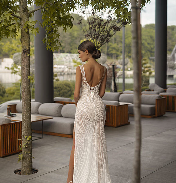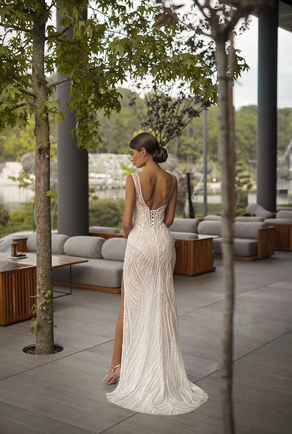 Astonishing one-shoulder mermaid gown fully covered in beaded tulle featuring a lace-up back. The bodice and top of the skirt are decorated with beads . The gown can be complemented with bicep-length sleeves .
